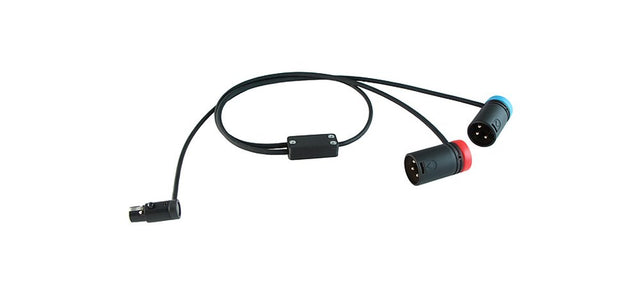 Right Angle TA5F (90 exit) to (2) LPS-TA3F [CH1 Blue/CH2 Red]. 4-position adjustable right angle TA5F at 0, 90, 180 and 270. You can adjust the outlet orientation of the TA3F connectors from 60 to 120 and 210 to 330 to work with many available gear input panels.