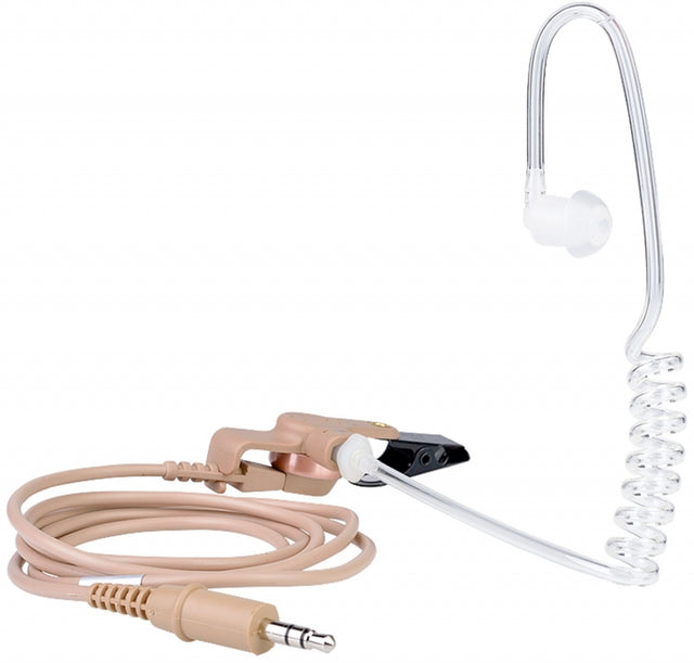 It includes an audio driver, ear tips, coiled acoustic eartube with clothing clip, and a 5 ft (1.5m).