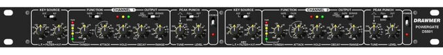 Positioned in the Drawmer range over the industry standard DS201 Dual Gate, the DS501 Power Gate features a new dual mode 'tuneable' Peak Punch processing section on each channel. In tuneable mode a fully variable frequency selector with a range from 75Hz to 16kHz allows the user to shape the transients of the gated signal and 'tune-in' to the particular area of the audio spectrum where the Peak Punch is to be active. In addition a variable 'more' control allows the user to tailor the amount of processing. A secondary Full Band Peak Punch mode is also available.