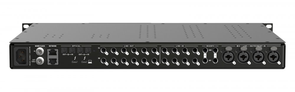 Thunderbolt four and USB four interface, 28 in 32 out, four mic pres, ADAT optical, AVB networking, 64 channel DSP mixer, dual headphones, talkback, A B C monitor control