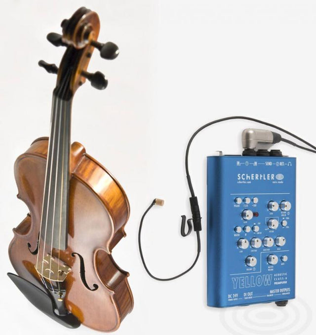STAT-V-ROAD includes the contact microphone, putty, cable and Schertler's sophisticated YELLOW BLENDER preamp with regulated AC power supply. The preamp enables players to control a range of parameters including gain, EQ and resonance.