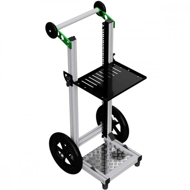 The MiniCart is a lightweight, compact and highly customisable sound cart. It features rear 12″ wheels as well as a height-adjustable shelf (which also folds flat without tools), rear handles and front feet.