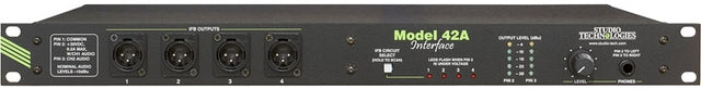Compatibility The Model 42A is compatible with virtually every digital matrix intercom system, including those from Clear-Com, RTS, and Riedel. Interfacing requires only the connection of analog output ports from the intercom system to the Model 42A's audio inputs. Optimal performance will be gained by configuring the nominal audio level of the intercom system's "virtual" IFB output ports to match the Model 42A's nominal +4 dBu input level. With the Model 42A's excellent audio and power delivery performance it's an ideal alternative to the interface devices offered by the intercom system vendors. Using the Model 42A the intercom system's audio quality can be maintained all the way to the IFB users.