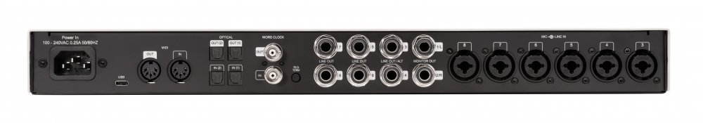 24-in 28-out USB, Eight vintage preamps, analog compressors, 32-bit conversion, ADAT expandability, mobile-ready, LUNA and UAD plug-in suite included