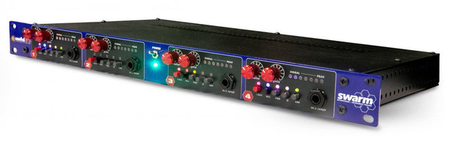First came the Hornet - an affordable, handheld preamp/DI that sounds as good or better than any of the $1000+ solid state preamps on the market. Discrete transistors and transformers on both the input and output - combined with the Useful Arts exclusive color control - give the Hornet a positively huge sound. Now, make room for the SwarmTM - a single rackspace unit, hand-built in the USA, with four independent Mic/DI channels that takes the Hornet to a whole new level. Sonically, the Swarm delivers the same huge sound as the Hornet, but its rackmount form factor makes room for extra features including a high pass filter, 22dB pad and phase control. Like the Hornet, the Swarm features discrete gain cell topology, a custom Cinemag input transformer, and a JFET DI. Dial in the Color control, and the personality of your microphone or instrument is enhanced and thickened without the need for compression or EQ.