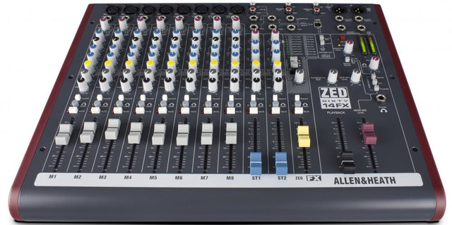 Engineered with premium 60mm faders and Allen & Heath's signature MusiQ EQ, it provides hands-on, responsive control and tonal shaping. A standout feature is the integrated effects engine, delivering 16 professional-grade FX presets like reverb, delay, and modulation to enhance any live mix. With multiple stereo input options (TRS and RCA), XLR main outputs with insert points, and a rugged build quality, the ZED60-14FX is a reliable workhorse that adapts easily to a wide range of live and recording environments.
