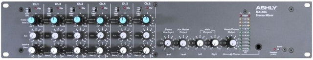 The mixer must be manufactured in The United States of America, with a shipping weight of 14 pounds. The mixer shall be the model MX-406, manufactured by Ashly Audio, Inc. No other unit shall be acceptable unless data submitted from an independent test laboratory verifies that the above size/performance specifications are met.