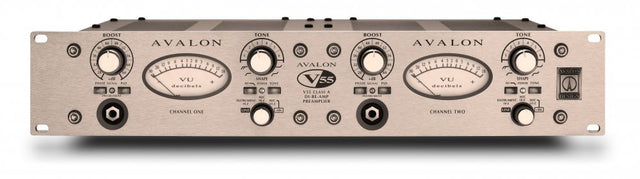 SONIC EXCELLENCE The Avalon V55 DI-RE-MIC Preamplifer is an ultra-high performance professional dual channel preamplifier, DI and RE-amper. Created for maximum versatility, the V55's sonic signature - "Deep and Controlled Bass, Musical Mid-range and enhanced Vocal Projection" combine with a unique set of user features including, 100% discrete Pure Class A amplification, Avalon's unique "passive" TONE-BANK™, professional VU meter with dual peak LED's, multiple outputs including an instrument level transformer isolated Re-amp. Designed to optimize absolute signal integrity and musical performance, the V55 is ideal for ribbon, dynamic and condenser microphones, bass guitar, acoustic instruments, electric guitars, keyboards, synthesizers, and very low output passive pickups.