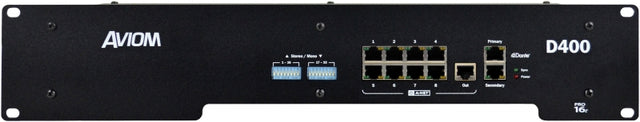 The D400 A-Net Distributor provides the link between the personal mixing system's inputs and the Personal Mixers, providing power and a copy of the digital audio stream to your Aviom Personal Mixers, utilizing standard Cat-5e cables.