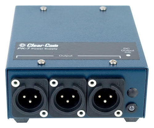 The PK-7 power supply is housed in a rugged metal chassis and has the capacity to power up to 12 RS-701 headsets. It supplies 24 volts DC at 0.4 amp to the system. The fully regulated, current-limited unit also provides proper termination for the intercom system. The PK-7 features both short-circuit and reverse polarity protection.