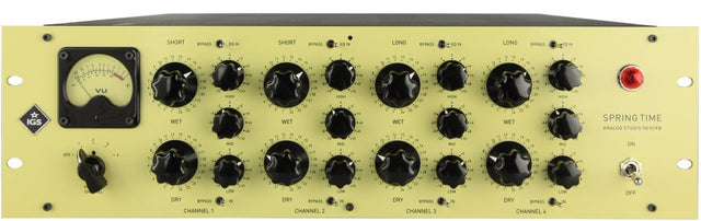 The IGS Springtime is a 4-channel analog studio reverb built using pairs of springs. One short and one long pair. Every channel has separate wet and dry volume knobs. Also, each channel has a 3 band EQ for the wet signal.