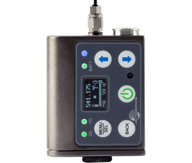 A water resistant control panel with OLED, membrane switches and multi-color LEDs make input gain adjustments, frequency and compatibility mode selection quick and accurate. The battery compartment accepts industry-accepted AA batteries (lithium recommended).