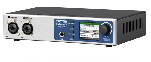 The latest Digiface AES is a professional, bus powered 14 input and 16 output channel USB 2.0 interface with 2 Mic/Line universal analog input channels and 4 analog output channels (2 XLR, one TRS phones) complementing its digital I/O section. With an excellent set of digital connectivity, SteadyClock FS, full stand-alone operation and built-in parametric EQ, the Digiface AES shines as the perfect all-in-one solution for recording and playback of digital and analog sources, as well as flexible playback/monitoring via TotalMix FX.
