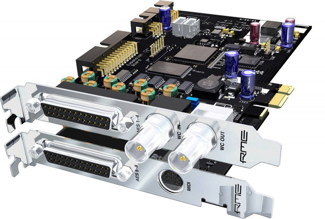 The card's mainboard contains word clock I/O and a 25-pin D-sub connector, providing four AES inputs and four AES outputs via standard digital breakout cable (Tascam pinout). The sensitive word clock input operates on Single, Double and Quad Speed signals automatically. The expansion board adds audio channels 9-16 and a connector for a MIDI breakout Cable with two MIDI I/Os (four 5-pin DIN connectors). It does not require a PCIe slot.