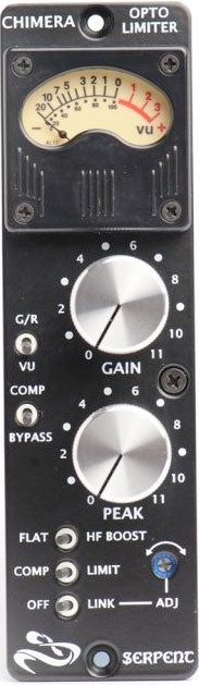 Faithfully replicating the vintage LA3A design, The Serpent Chimera brings the classic Opto sound to 500 series format. Featuring an all discrete circuit design, Orange Drop and Elna capacitors, full steel enclosure & cover, class AB transistor output, true T4B optical cell, and transformer balanced input & output, the Chimera delivers the thick, rich, & smooth opto compression sound that you're looking for.