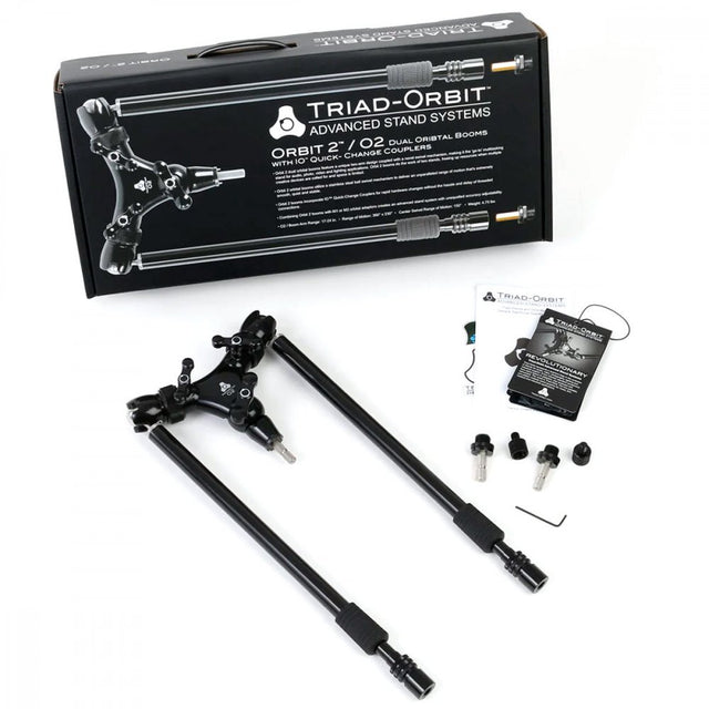 Orbit Series O2 orbital booms feature a unique dual-arm design " each arm equipped with the proprietary ORBIT ball swivel mechanism " making it one of the most versatile booms on the market. Applications across multiple disciplines are now a reality; today it is the ‘go-to' stand for stereo or dual miking assignments such as grand pianos, snare drum (top & bottom), guitar and vocals, choirs, big bands, and orchestras " Tomorrow it is the center of a full A/V multimedia or Social Media solution holding lights, cameras, microphones. Orbit 2 booms do the work of two stands, freeing up resources when multiple devices are called for and space is limited.Dual boom arms are only part of the ORBIT 2 story. Anchoring ORBIT 2 is a novel center swivel that provides an additional 45 of left-right motion to the boom arms. The Compass Point ball swivel housing provides each O2 boom arm with precise, stable positioning whenever the arms are engaged. And iO Quick-Couplers terminate the end of every O2 arm, offering twice the versatility of conventional booms in a fraction of the time it takes for normal setups.