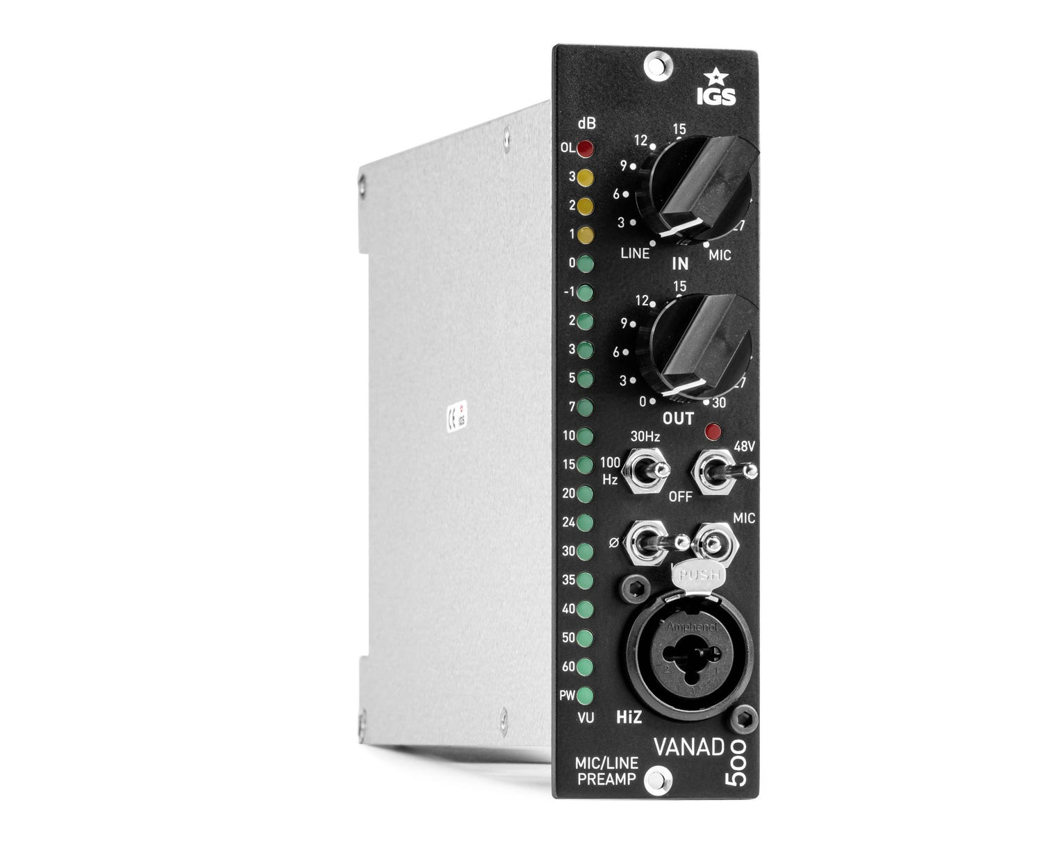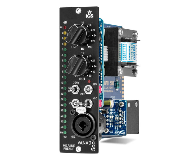 The IGS Audio Vanad 500 is a versatile, character-rich mic/instrument preamp built in the API 500-series format, ideal for engineers seeking vintage tone with modern control. Equipped with Carnhill input and output transformers, the Vanad 500 delivers a warm, harmonically rich sound that enhances everything from delicate vocals to aggressive guitar lines. Designed for maximum flexibility, it features both rear XLR and front-panel Hi-Z inputs, making it an excellent tool for tracking microphones, instruments, or line-level sources with equal precision.