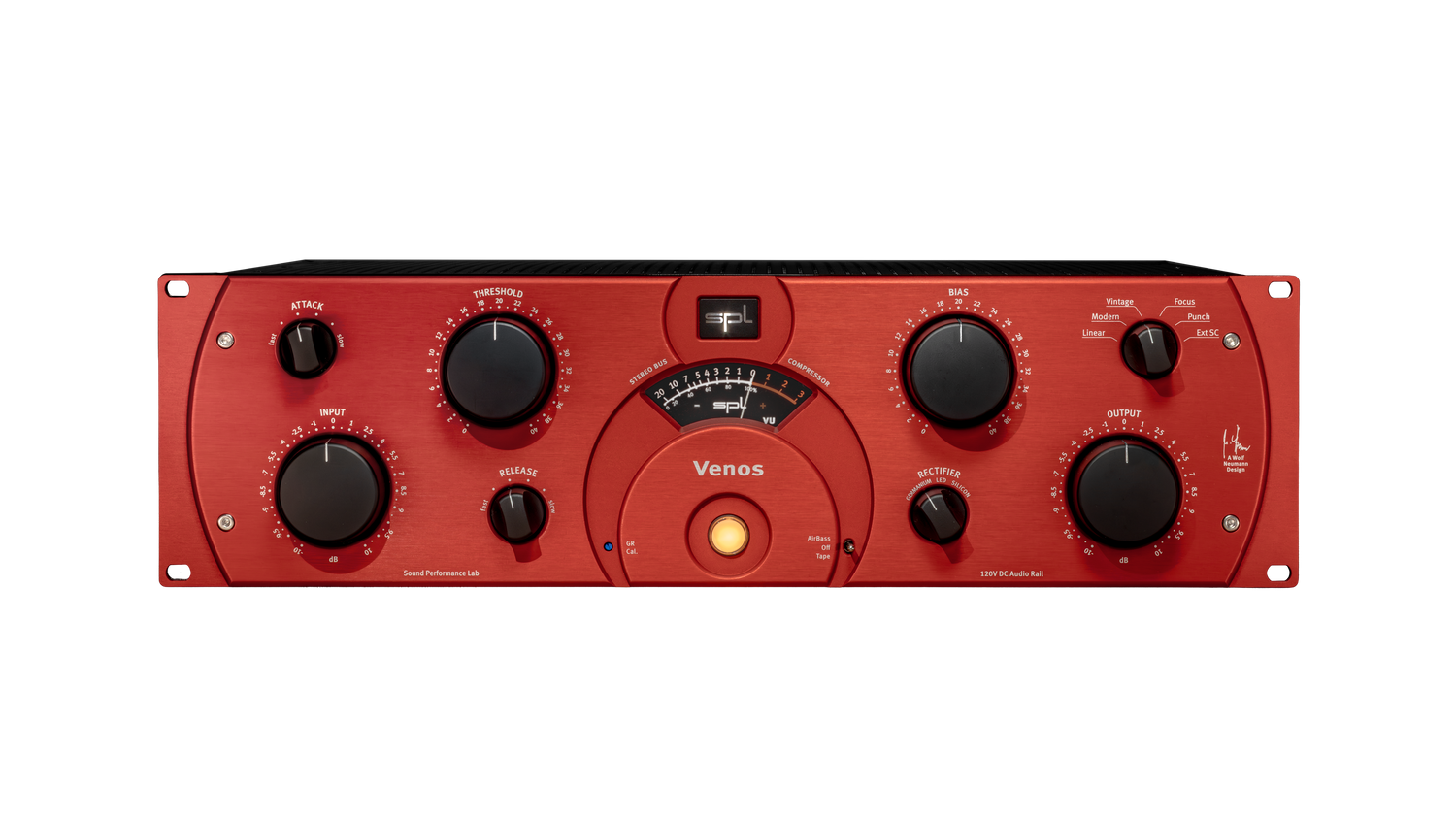 Functionality and user experience are central to the Venos design. Every control, Input, Threshold, Bias, Attack, Release, Rectifier, Output, is finely stepped or switch-based for easy recall and precision. Additional creative tools include switchable analog EQ presets (AirBass and Tape), a side-chain insert for external control, and selectable rectifier types that affect the compressor's response. On the technical side, the Venos features SPL’s renowned 120V rail technology, providing superior headroom, minimal distortion, and an ultra-clean signal path. Built for reliability and inspiration, the red version of the Venos is not only a sonic powerhouse but it’s also a visual centerpiece for any mastering suite, mixing desk, or high-end studio rack.