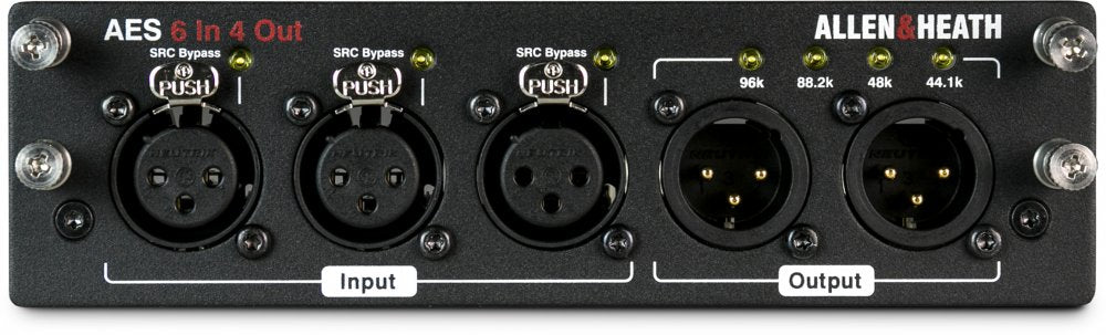 dLive/Avantis Audio Interface Cards AES3 I/O cards provide a convenient solution for digital patching from a dLive system to system PA, monitor amps and speaker controllers, or for console combining. Four different cards are offered to fit a wide variety of I/O requirements: 2 in / 8 out, 4 in / 6 out, 6 in / 4 out, and 10 out. The cards' output sample rate is switchable between 96kHz, 88.2kHz, 48kHz and 44.1kHz, while the inputs provide sample rate conversion from 32kHz to 192kHz.