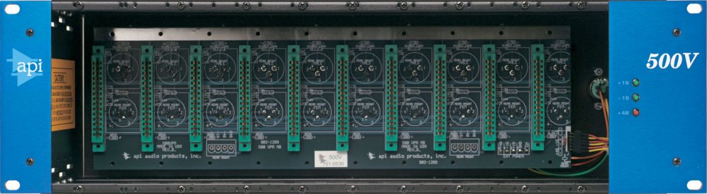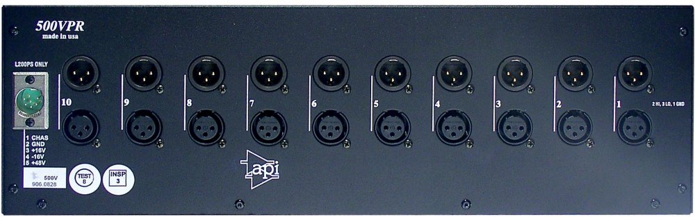 The API Model 500VPR is powered externally by a tri-polar power supply and is designed to accept API standard format 5.25" X 1.5" modules. The 500VPR is internally wired for PIN 2 hot, and comes with the API L200PS. The input/output jacks are both XLRs. The 500VPR can hold up to ten API modules. API makes several modules to fit this rack, including the 550A, 550b, 560, 525, and 512c. Like all API products, the 500VPR rack enjoys API's standard 5 year warranty.