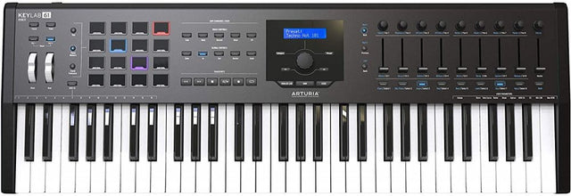 Arturia's premier MIDI controller, KeyLab MkII 61 represents a quantum leap in terms of control, quality, and expression. Featuring a responsive keyboard action with 61-keys, aluminium chassis, advanced configurable interface, 16 RGB backlit performance pads, 9 large faders, 9 rotary encoders, 5 expression control inputs, 4 CV outputs, smart category controls, and - of course - MIDI and USB connectivity. Included is an impressive software bundle: Arturia's complete Piano V virtual piano instrument, Analog Lab 3, and Ableton Live Lite. A truly majestic MIDI controller A new generation of MIDI controller is here, with a focus on incredible build quality, superb durability, expressive control, and ergonomic features that are simply a joy to use, and a pleasure to behold. Everything about this controller is the result of careful thought and research. Its DAW control section feature easily switchable magnetic strips for maximum personalization. The interface is laid out in a smart way that keeps the learning curve to a minimum. Its CV functionality lets you take control of vintage outboard synths or modular devices. KeyLab MkII is a controller for control freaks. Professional in every way From its solid metal housing to its responsive performance pads; its programmable user maps to the advanced connectivity; KeyLab MkII is a controller keyboard that puts you in the driving seat. Take full control over your DAW, instruments, effects, and outboard equipment using its hugely configurable user maps, and assign any parameter you want to its multiple switches, performance pads, rotary knobs, and large faders. Expressive and inspiring The focal point of a controller keyboard is often one of its most overlooked features. Not with KeyLab MkII! This total control solution features the superbly playable, luxurious-feeling keybed found in Arturia's flagship MatrixBrute synthesizer. Calibrated to capture every nuance of your performance, from soft flourishes to hammering chords
