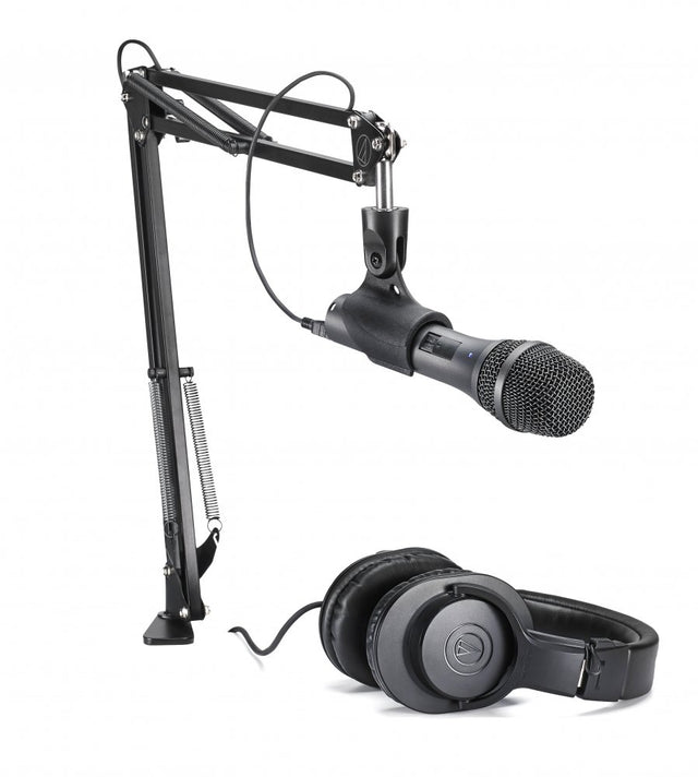 The pack includes an AT2005USB cardioid dynamic USB/XLR microphone, a pair of ATH-M20x professional monitor headphones and a studio boom arm threaded with a USB cable.