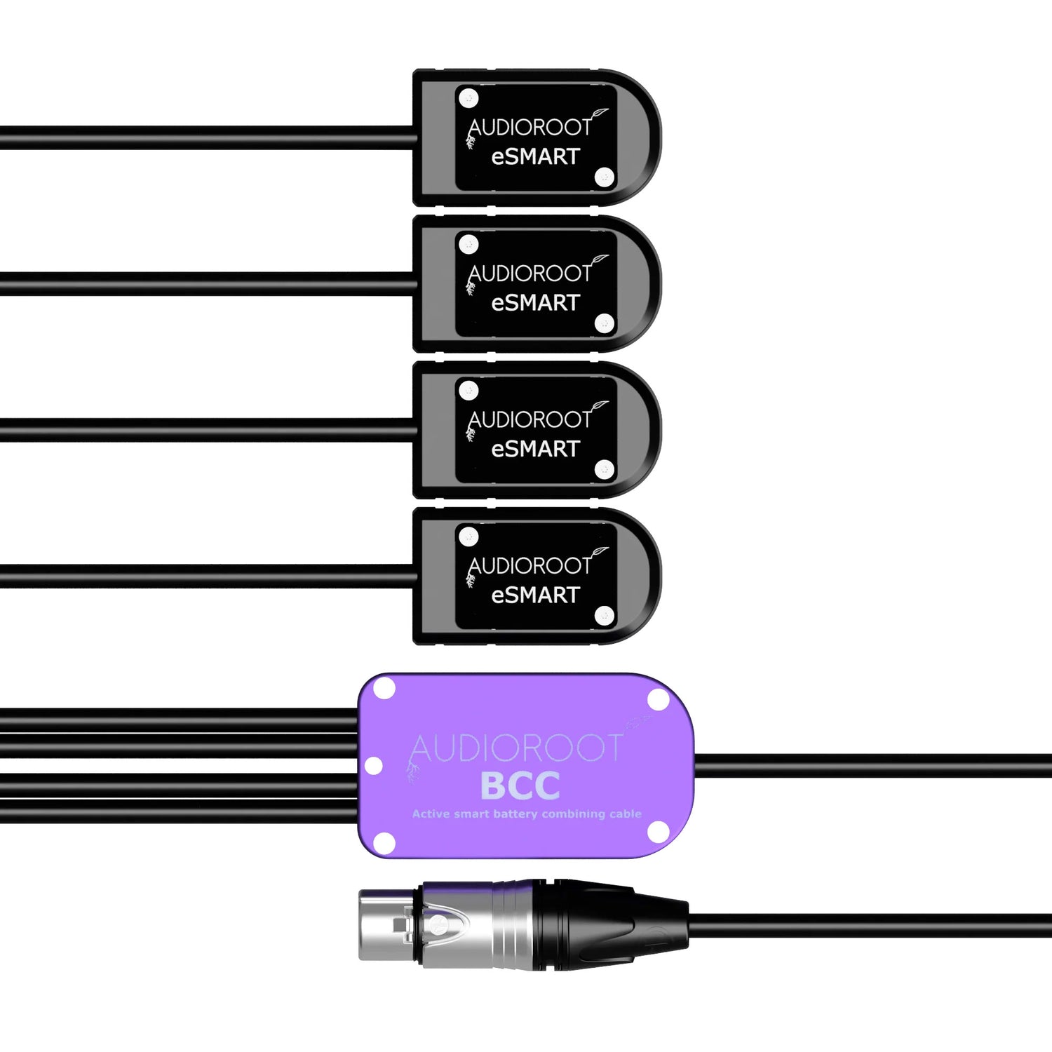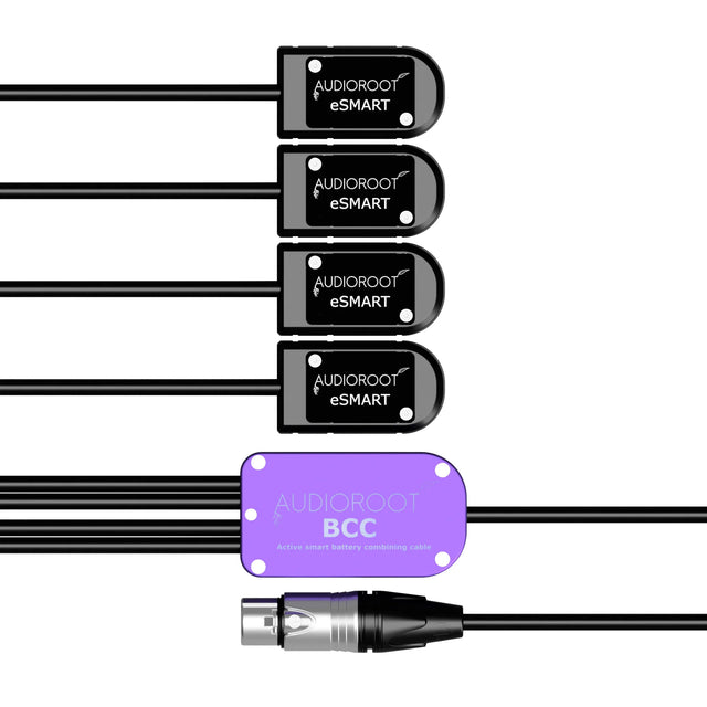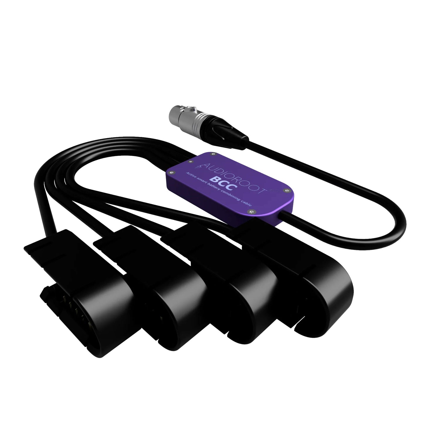 The AudioRoot BCC-CCCC-X is a four-input smart power combining cable designed for high-capacity, redundant, and telemetry-enabled power delivery in professional location sound setups. Featuring four battery cup inputs and a 4-pin XLR (XLR4) output, this cable merges both power and SMBus data to provide uninterrupted operation and full real-time battery status monitoring all through a single, streamlined output.