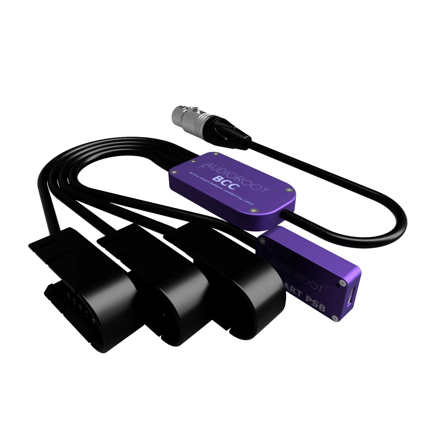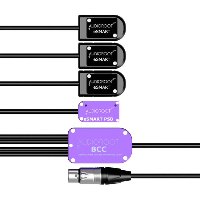 The AudioRoot BCC-CCCU-X is a highly flexible, telemetry-enabled power combining cable engineered for demanding portable audio setups that require maximum uptime, smart power management, and AC/DC redundancy. Featuring three battery cup inputs, a USB-C power input, and a 4-pin XLR (XLR4) output, this cable enables seamless merging of up to four power sources into one unified, intelligent power stream while preserving SMBus telemetry communication.