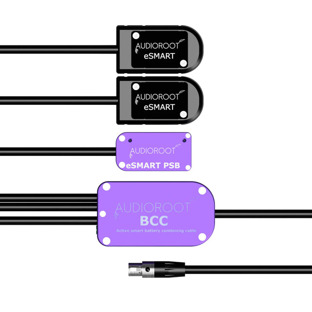 Part of the BCC (Battery Combining Cable) series, this cable actively merges both power and SMBus telemetry, emulating a single smart battery for seamless communication with Audioroot’s power distributors such as the eSMART BG-DU, DUO, TRIO, and K-ART. This enables real-time monitoring of battery status, voltage, current draw, and runtime estimation which is vital data for field audio professionals.