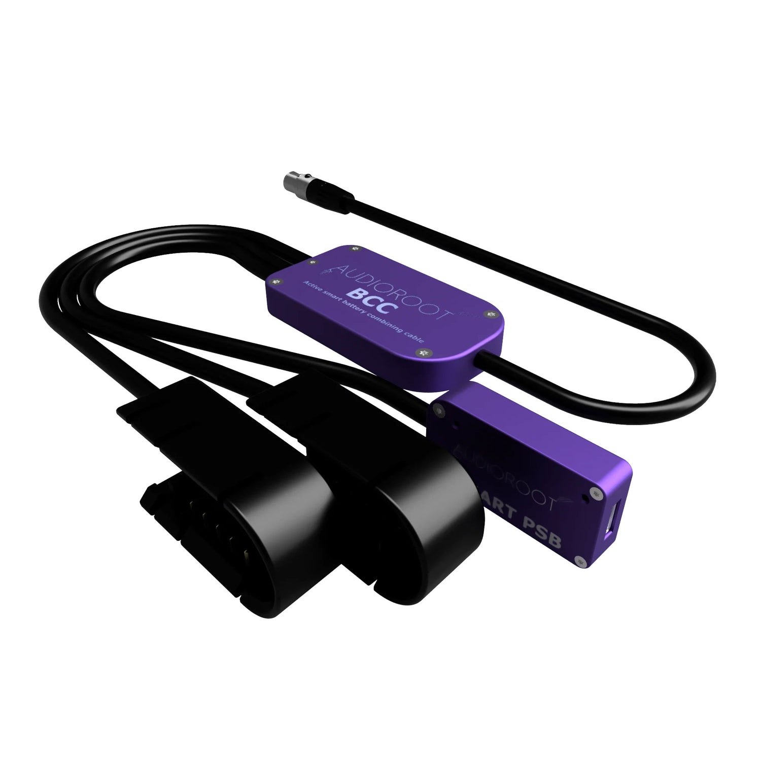 The AudioRoot BCC-CCU-T is a compact and intelligent power combining cable designed for professional portable audio setups that demand reliable, redundant power delivery with full smart battery telemetry. It features two battery cup inputs and one USB-C input, merging all power sources into a single TA4M output, ideal for streamlined integration in TA4-equipped systems and bags.
