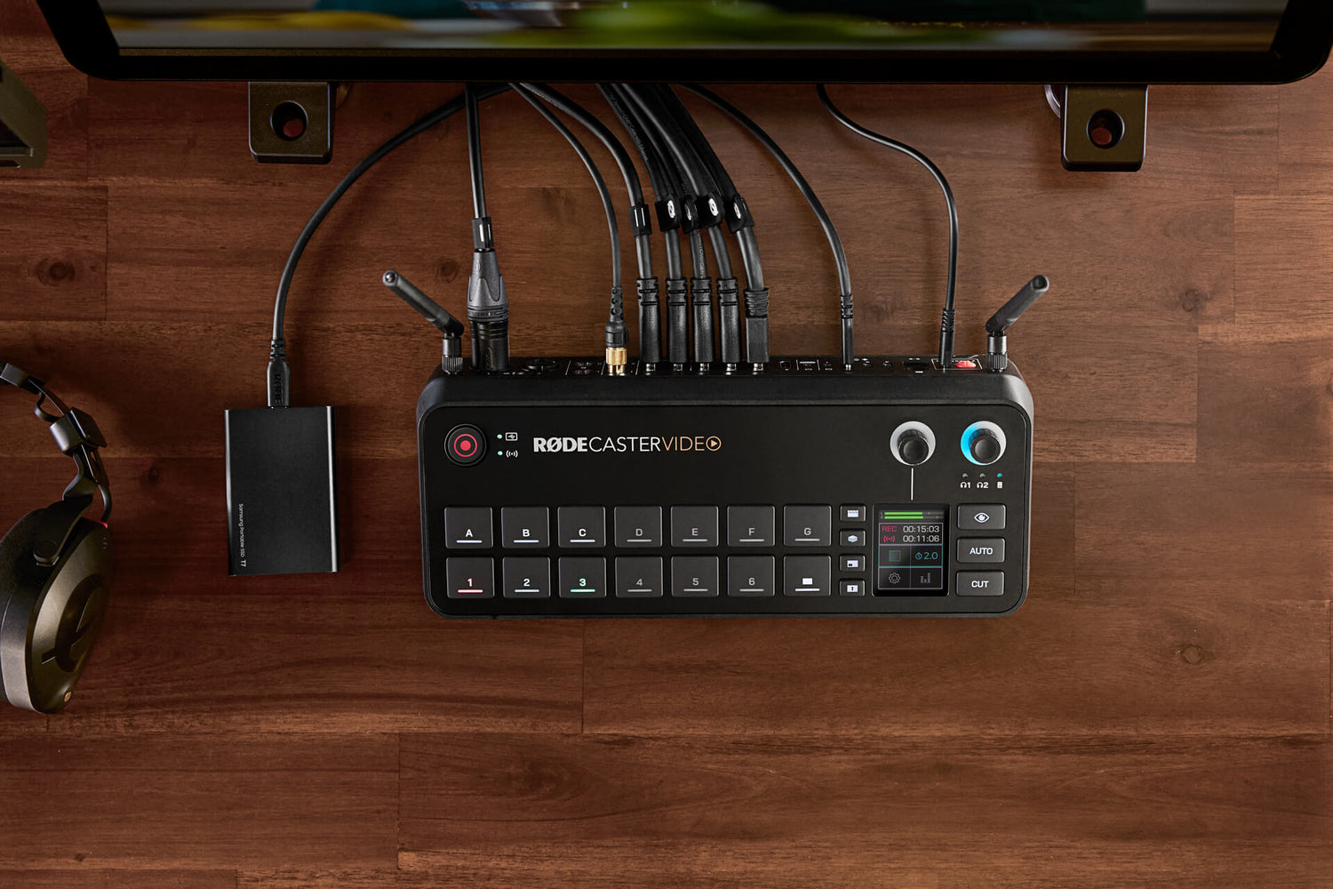 It supports up to six video inputs, including four HDMI and two USB-C connections for cameras or compatible devices. Users can build and trigger up to seven fully customizable scenes using layered video, graphics, and media elements. The console features integrated wireless receivers for RØDE microphones, APHEX audio processing across nine audio channels, and automatic background replacement with built-in chroma keying. Content can be streamed over Wi-Fi or Ethernet and recorded directly to external USB storage, with options for multitrack audio and isolated video files for flexible post-production. All settings, routing, and scene controls are accessible via the touchscreen or through the companion RØDECaster App for remote operation.