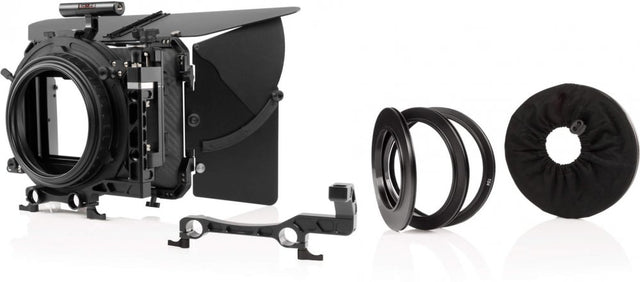 A top flag and two side flags are included to prevent unwanted flare, and a top handle with five threaded holes allows you to mount additional accessories such as lights, extension arms, and adapter shoes. The entire system is built on a hinge so you can easily swing the matte box away for lens and filter changes.