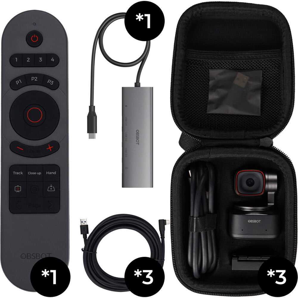 Each Tiny 2 webcam includes a 1/1.5" 50MP CMOS sensor, AI auto-tracking, gesture and voice control, and 4K video capture with enhanced HDR and lightning-fast autofocus. Paired with the OBSBOT Smart Remote Controller, you can switch between cameras and control PTZ features seamlessly. The kit also includes a 3-in-1 USB 3.0 hub for connecting all three webcams to one system, three long USB-A to USB-C cables, a quick charger, and mounting accessories.