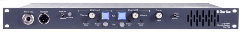 The RM-702 is a 1RU two-channel remote station with programmable front panel buttons and individual channel volume control. The RM-702 is powered directly from the intercom line and requires no external AC power.