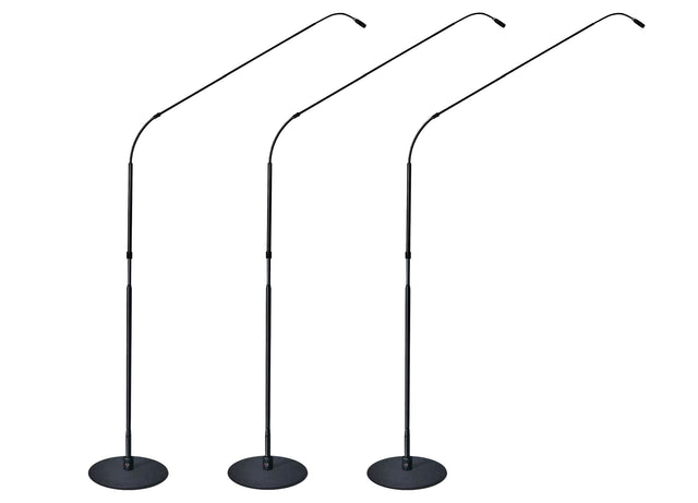 Three matched 30kHz cardioid mics with 7 ft stands, sleek low-profile bases, wide pickup, 32dB rear rejection, perfect for full-choir and ensemble miking.