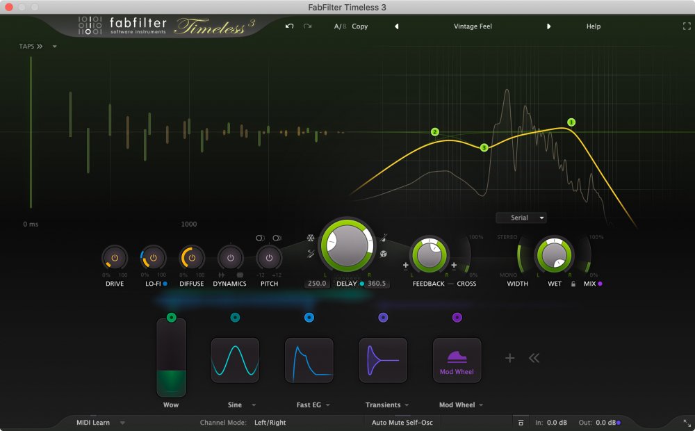 FabFilter Timeless 3 is an advanced, powerful, and modern delay plugin. Timeless 3 has 2 independent, programmable delay lines, together with high-quality effects and filters, and a super-flexible modulation system. With Timeless 3, you can create any type of delay in no time. A lot of effort went into designing the interface, making it pleasant and efficient to work with.