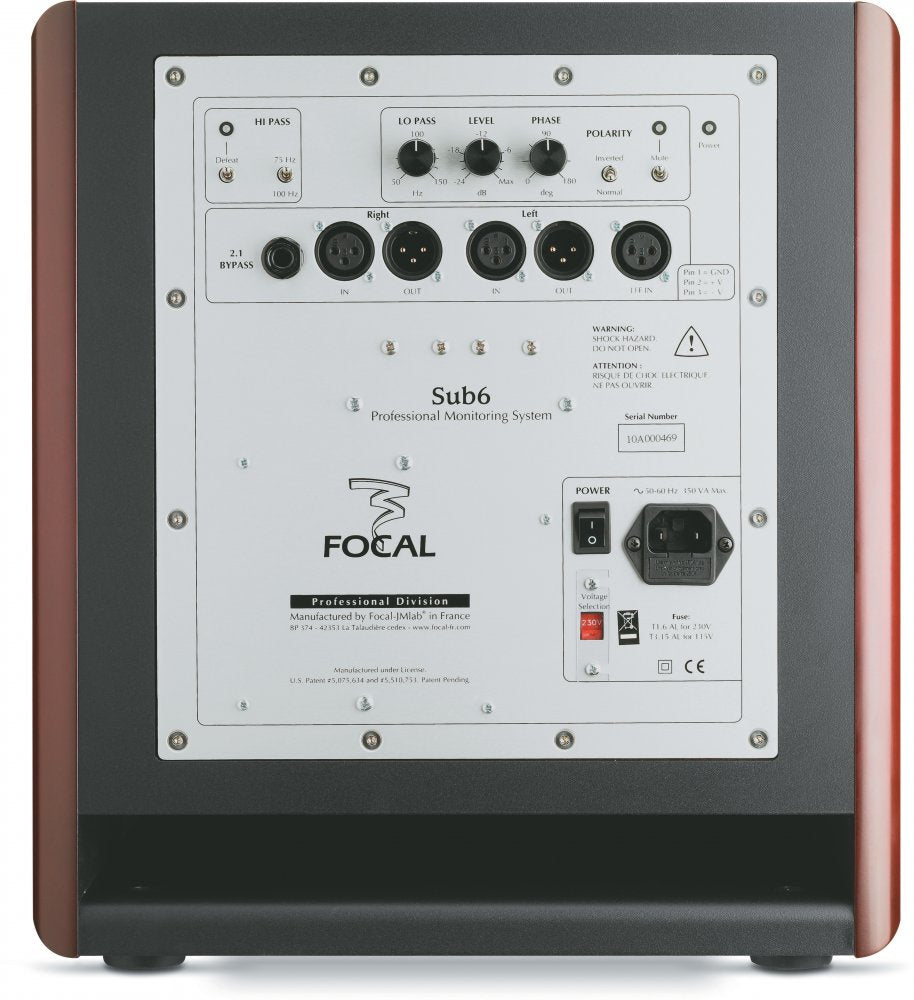 FOR OPTIMAL INTEGRATION The Sub6 monitor loudspeaker was developed to perfectly complement the acoustics of Focal monitoring loudspeakers. It features numerous settings such as a stereo high-pass crossover (75Hz - 100Hz) specific to left and right loudspeakers, a configurable low-pass filter with mono summation, a phase inverter, adjustable phase and even a MUTE switch. The various connectivity options enable use in 2.1, 2.2 and multi-channel modes, via the L/R inputs and outputs, and the LFE input.