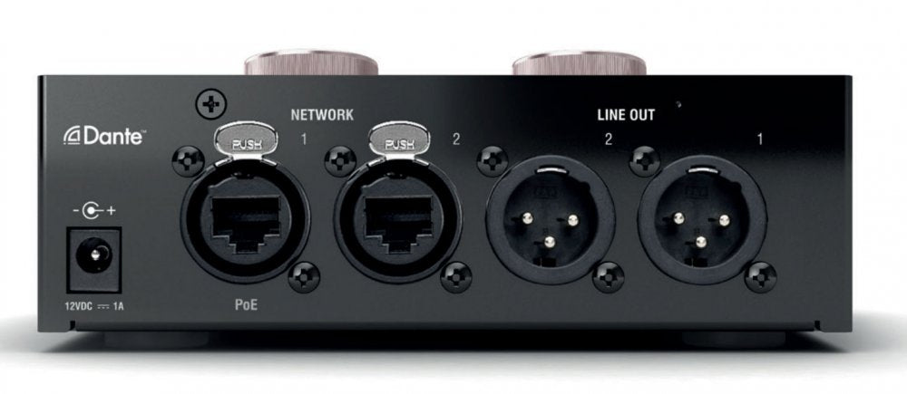 RedNet AM2 includes the latest two-channel Dante receiver and provides high-quality digital to analogue conversion for accurate monitoring on loudspeakers or headphones. Two large volume control knobs are provided for Headphone and Line output levels, the latter featuring a mute button with associated LED. Other indicators show the presence of power, network and signal level.