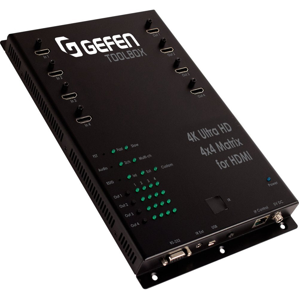 The Gefen GTB-HD4K2K-444-BLK ToolBox 4-4 Matrix for HDMI is a compact and lightweight alternative to rack-mounted matrixes. It allows up to four Ultra High Definition 4K or 1080p Full HD sources to be routed to up to four Ultra HD displays. Each Hi-Def source can be routed to either of the connected displays using the front panel push-button controls, the included IR remote, RS-232 serial control interface, or through IP, using Telnet, UDP, and the built-in web server interface. LED indicators on the top panel display the current routing status, FST mode, audio configuration, and EDID settings.