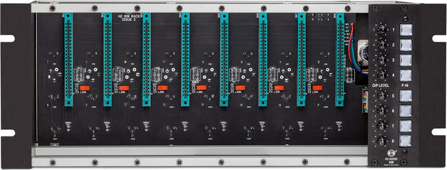 The Rack 008 offers 8 slots for H2 Audio 0011 Preamp + EQ modules in a proprietary format. It is delivered with an external power supply and a 6-pin cable.