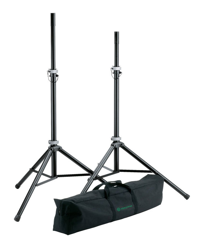 Two easy-to-carry speaker stands made of high quality aluminum in a carrying case. Fiberglass-reinforced fittings and an additional safety pin ensure stable support for the speakers. The height and feet adjust by an easy-to-use clamping lever.