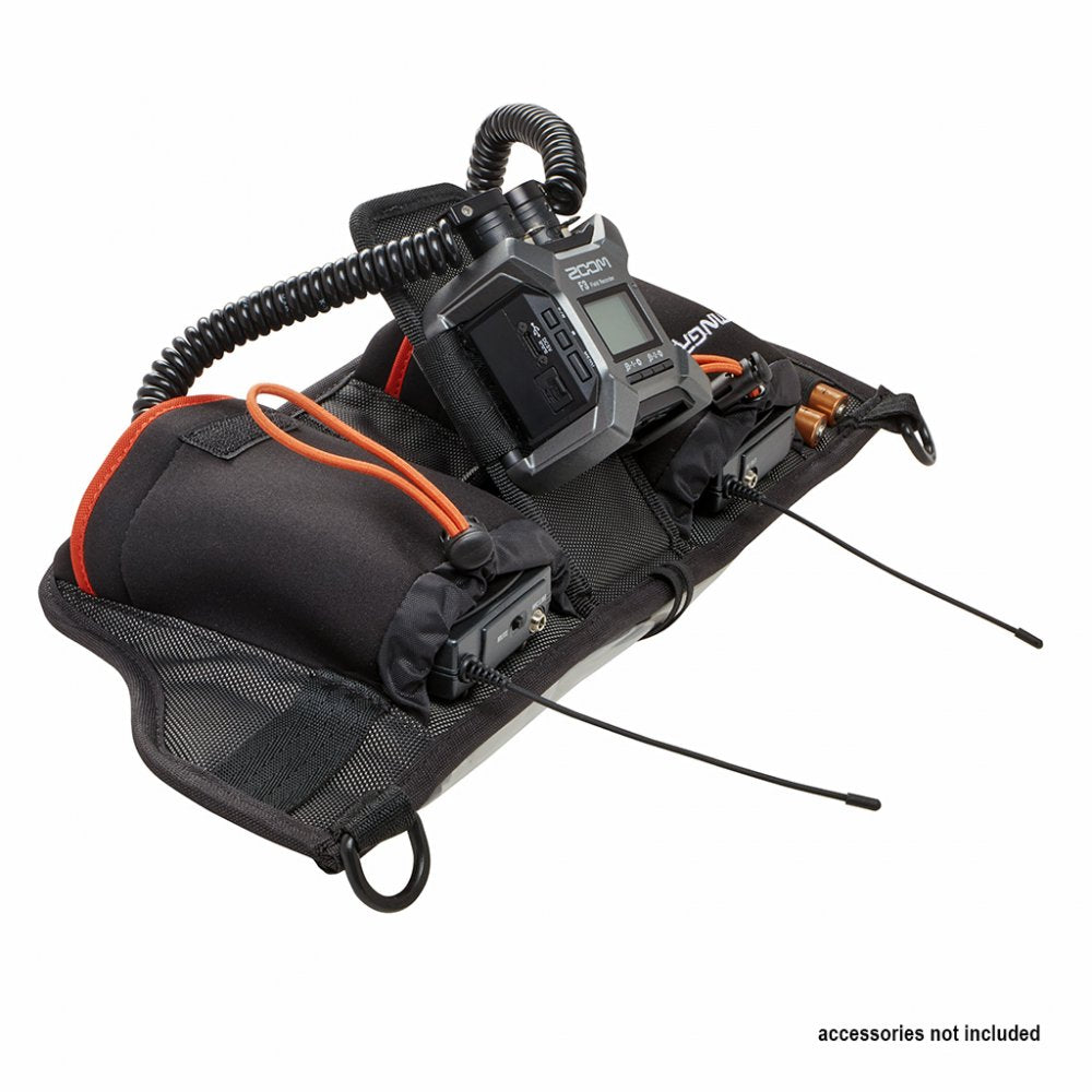The K-Tek Stingray F3 Action Belt for sound recording professionals or videographers includes two front straps for a Zoom F3 Portable Field Recorder. Additional features include: