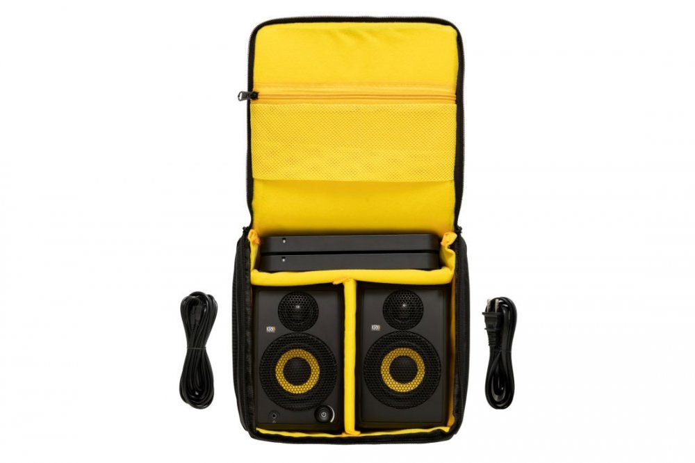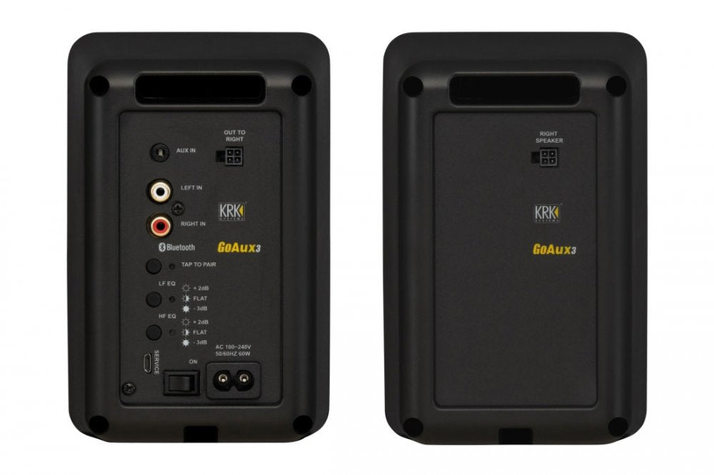 The KRK GoAux 3 portable nearfield monitors are designed to provide great sound anywhere you go. The perfect monitors for traveling musicians and engineers, they deliver renowned KRK sound quality in a mobile-friendly size. Since they're made to go wherever you do, the GoAux 3 monitors come with a convenient nylon carrying bag that holds both monitors as well as the included monitor stands and any extra cables you want to take along with you. The stands are adjustable for the optimum monitoring positioning and angle. The GoAux 3 monitors pair a 3" glass aramid woofer with a 1" soft textile dome tweeter in a 60 W RMS (total system power) bi-amplified two-way design. The rear-ported ABS cabinets are durable and supply surprising bass extension for a portable speaker. With the power amps located in one speaker's housing and the second speaker powered through an included speaker-level connection from the first, the pair only needs a single AC outlet for operation. Built-in LF and HF EQ let you adjust the monitors' response to the room and your personal preferences. Along with the 1/8" Aux and RCA stereo inputs, Bluetooth capability means you can connect wirelessly to your smartphone, computer, or other Bluetooth-capable audio devices. When you need to monitor silently, you can connect to the front panel 1/8" stereo headphone output, which automatically mutes the GoAux 3 speakers.