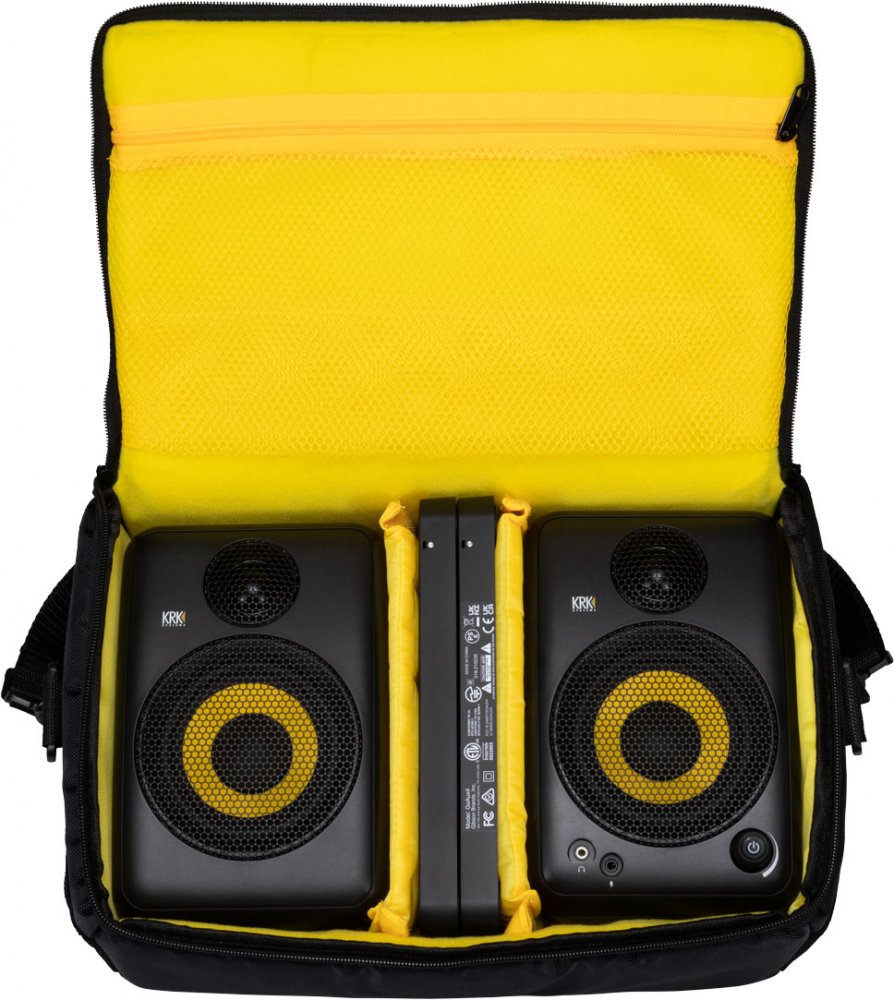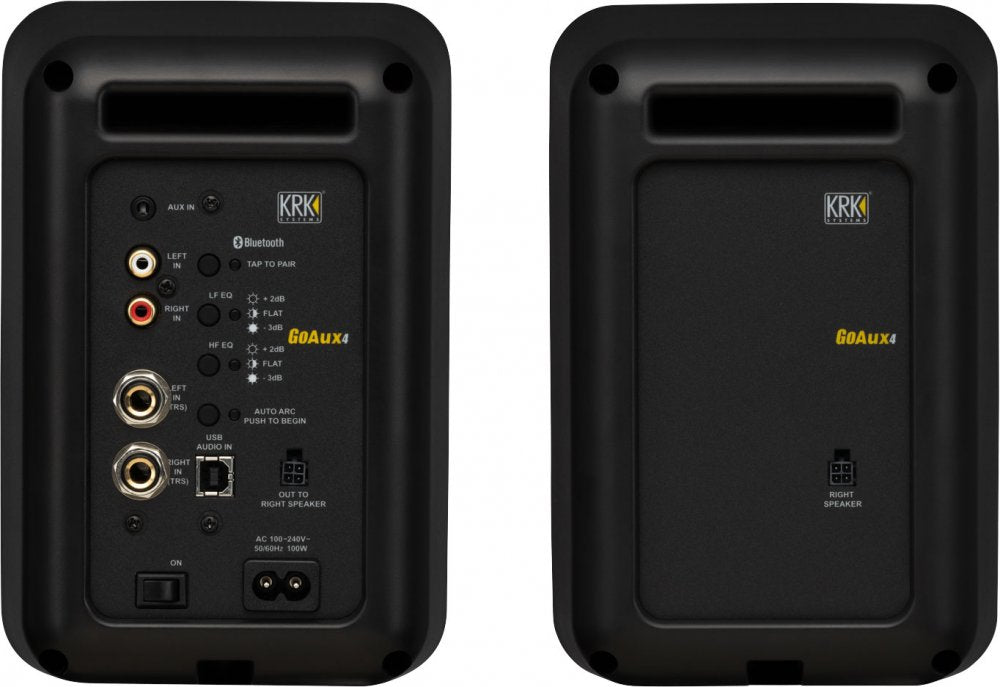 The KRK GoAux 4 portable nearfield monitors are designed to provide great sound anywhere you go. The perfect monitors for traveling musicians and engineers, they deliver renowned KRK sound quality in a mobile-friendly size. Since they're made to go wherever you do, the GoAux 4 monitors come with a convenient nylon carrying bag that holds both monitors as well as the included monitor stands, Auto ARC microphone, and any extra cables you want to take along with you. The stands are adjustable for the optimum monitoring positioning and angle. The GoAux 4 monitors pair a 4" glass aramid woofer with a 1" soft textile dome tweeter in a 100 W RMS (total system power) bi-amplified two-way design. The rear-ported ABS cabinets are durable and supply surprising bass extension for a portable speaker. With the power amps located in one speaker's housing and the second speaker powered through an included speaker-level connection from the first, the pair only needs a single AC outlet for operation. Built-in LF and HF EQ let you adjust the monitors' response to the room and your personal preferences. With the included measurement microphone, the built-in Auto ARC automatic room correction feature can automatically optimize the response of the speakers to your acoustic environment. Along with the USB, 1/8" Aux, RCA, and 1/4" TRS balanced stereo inputs, Bluetooth capability means you can connect wirelessly to your smartphone, computer, or other Bluetooth-capable audio devices. When you need to monitor silently, you can connect to the front panel 1/8" stereo headphone output, which automatically mutes the GoAux 4 speakers.