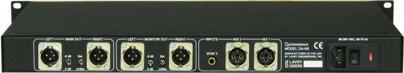The Quintessence has two AES and one SPDIF inputs, which accept standard sample rates from 44.1 kHz to 192 kHz. Switching between inputs recalls independent Monitor Volume settings from memory for ease of use and ABX comparison. Other features include BAL/UNBAL, Mono, Polarity Inversion, and personalized illumination settings.