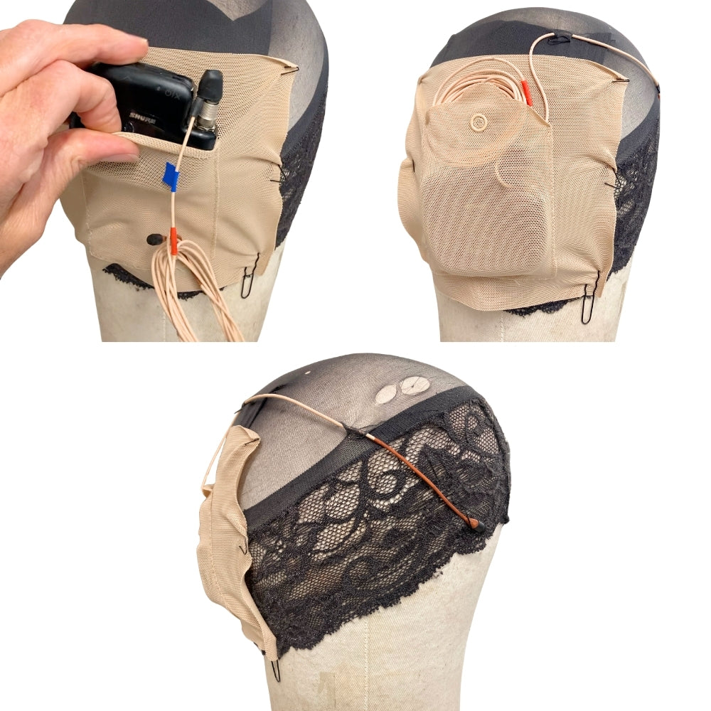 Holds one transmitter comfortably without adding bulk to costumes or wigs.