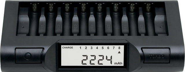 The Powerex MH-C980 Turbo Charger-Analyzer charges up to 8 AA or AAA nickel-metal hydride batteries in approximately 1 hour. This charger is the best combination of an 8-cell charger with battery health analyzing features. It has a special One-Touch Battery Health Analyzer with actual capacity readout to provide the most accurate data. The Turbo charge mode allows you to charge your batteries twice as fast while the default mode will maximize battery life. With the Thermal Management System, your batteries will stay cool during charge. For older batteries, you can use the Deep Battery Conditioning System to revitalize them. The large backlit LCD display allows you to take quick glance of the charging status.