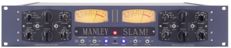 SLAM! stands for "Stereo Limiter And Micpre" and it pretty much describes what it will do to most VU meters. We had to put a switch on this limiter to drop its internal VU meters down 3 & 6dB to keep the poor little needles from bending- it'll get LOUD fast (hence the exclamation mark). And on top of being an amazing pair of (actually four) Limiters, and Class A tube mic preamps, it also has masters degrees in DI, AtoD and DtoA, VU and PPM but that was too much for an acronym.