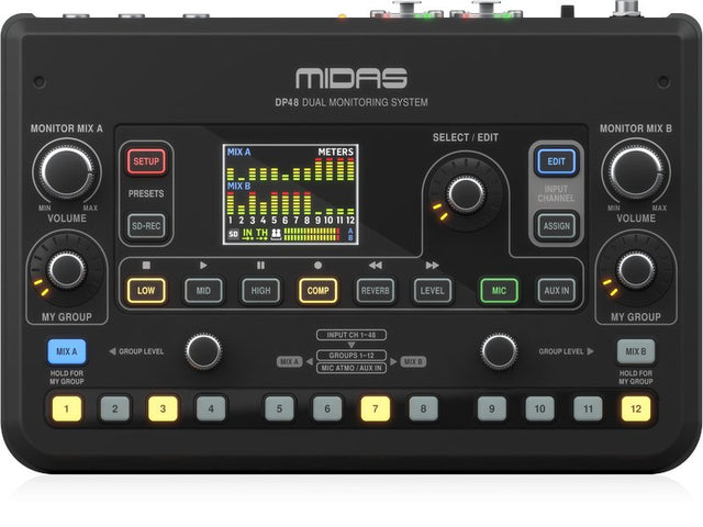 The Midas DP48 is a Dual 48 Channel Personal Monitor Mixer with SD Card Recorder, Stereo Ambience Microphone and Remote Powering