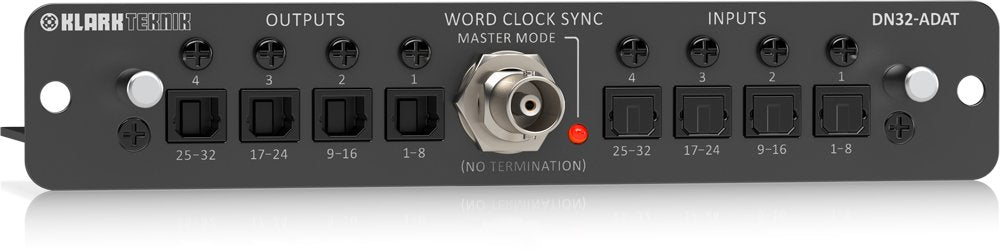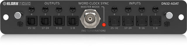 The Klark Teknik DN32-ADAT is an expansion module designed to enhance the recording and playback capabilities of Midas M32 and Behringer X32 digital mixing consoles. It provides up to 32 channels of bidirectional audio via ADAT optical interfaces, facilitating seamless integration with ADAT-compatible devices such as digital audio workstations, stand-alone recorders, and other digital mixers.